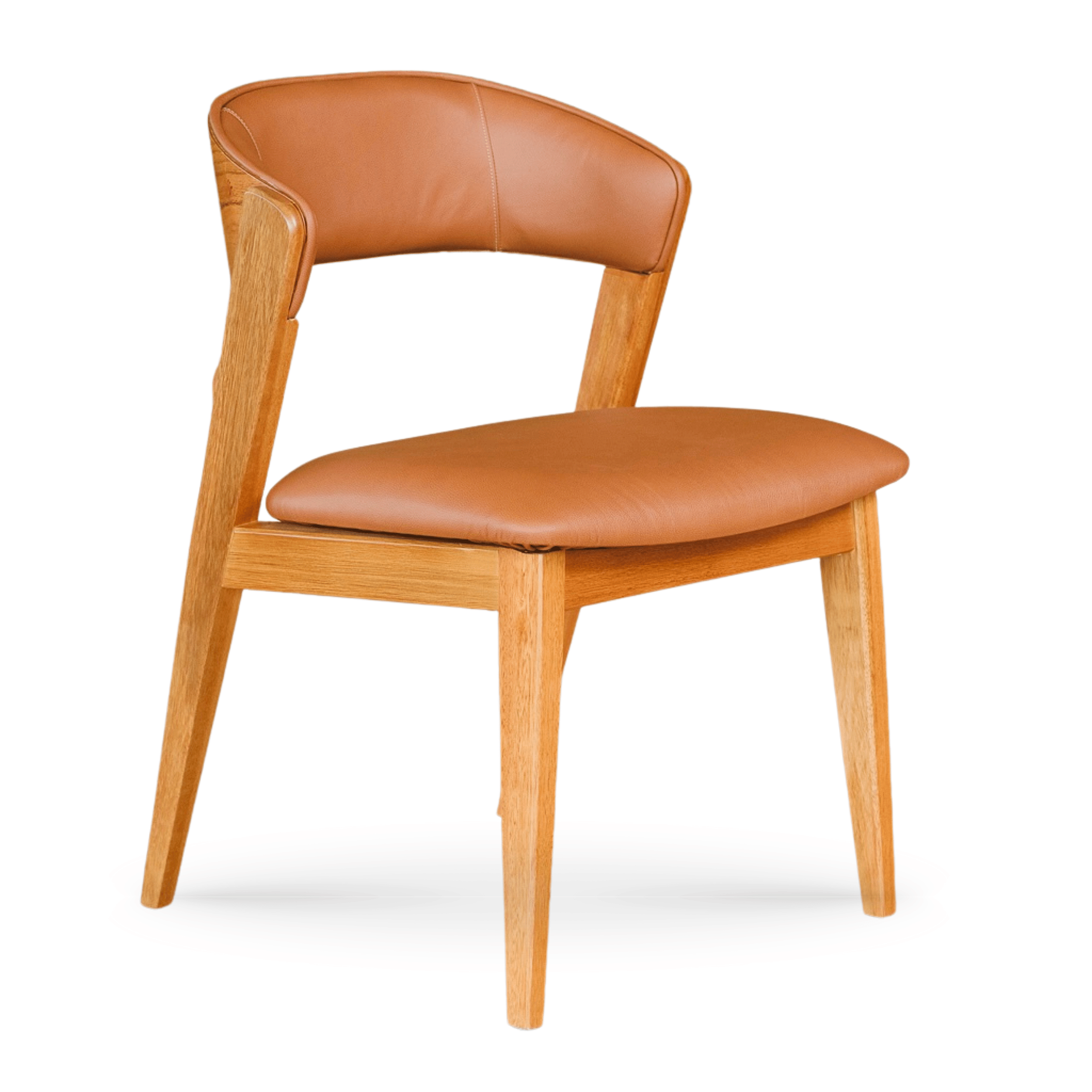 A Cadeira Meca é a tradução do equilíbrio entre design e conforto. Seu assento e encosto revestidos em couro legítimo trazem uma textura marcante e natural, enquanto a estrutura em madeira maciça confere robustez e durabilidade. O detalhe em madeira laminada na parte traseira do encosto valoriza o visual artesanal da peça, transformando-a em um destaque em qualquer ambiente.