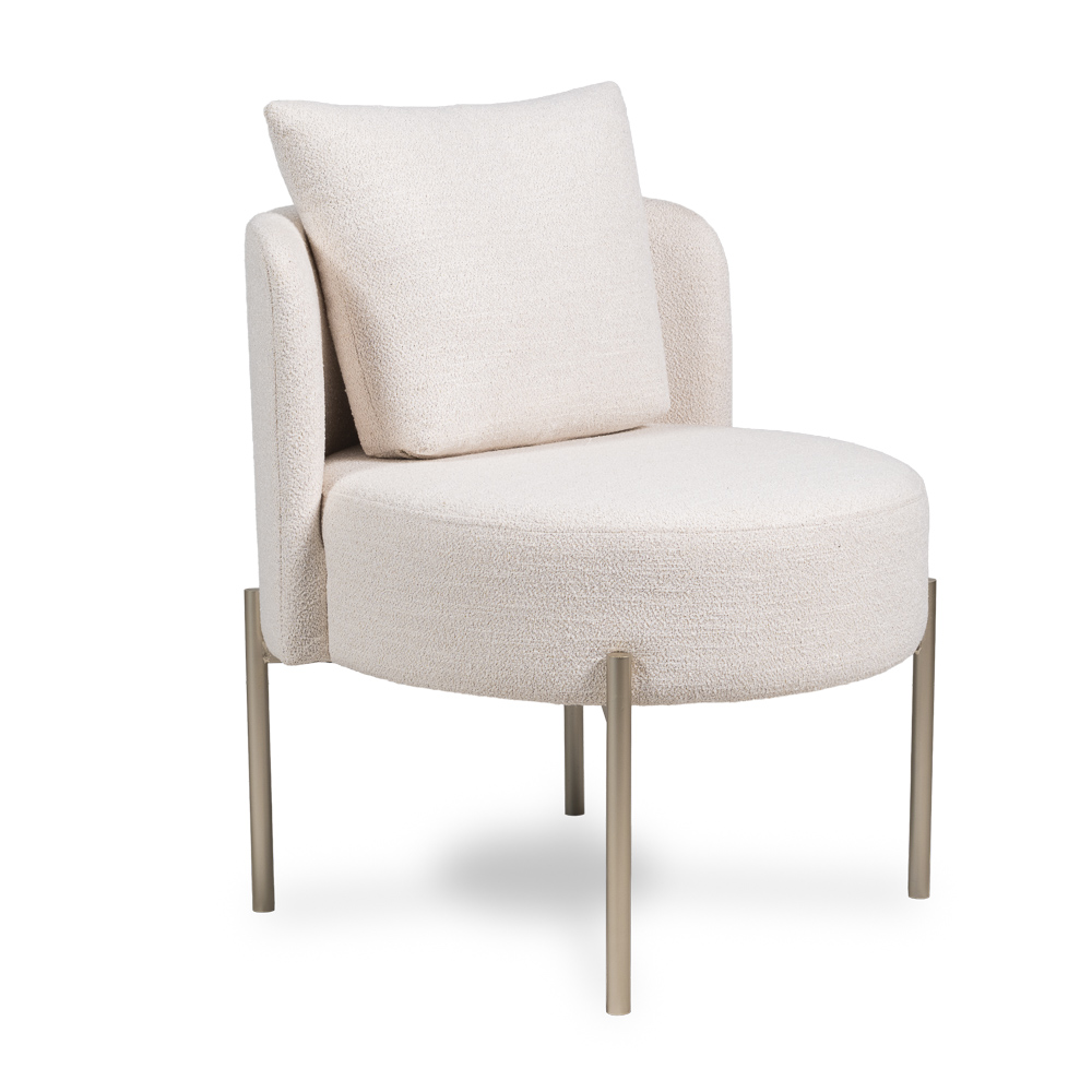 A Poltrona Versa foi criada para levar estilo e leveza aos ambientes sociais. Seu design leve, aliado ao revestimento em Bouclê e à base metálica champanhe, transforma qualquer espaço em um cenário acolhedor. Com almofada solta e tamanho compacto, é perfeita para salas de estar, livings, quartos ou qualquer ambiente que precise de conforto sem ocupar muito espaço.