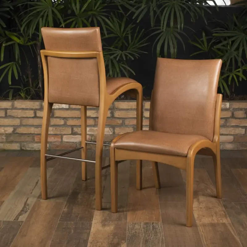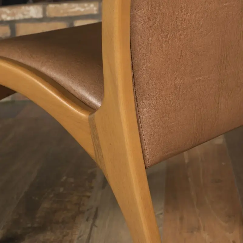 A Cadeira Londres oferece um assento e encosto estofados em courino caramelo, garantindo conforto em cada uso
